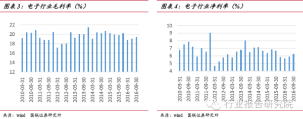 本文將電子行業(yè)按照申萬的行業(yè)分類,分為半導(dǎo)體、元件、光學(xué)光電子、電子制 造和其他電子五個子版塊。16 年前三季度,電子行業(yè)實(shí)現(xiàn)營收合計(jì)4067.24 億元,同比增長 25.71%;實(shí)現(xiàn)歸母凈利潤 254.78 億元,同比增長 22.13%。產(chǎn)業(yè)營收規(guī)模再次創(chuàng)出行業(yè)同期新高,產(chǎn)值和利潤規(guī)模均出現(xiàn)環(huán)比上升的勢頭,整體向好趨勢顯著。